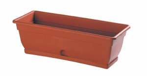 Terakotově zbarvený matný plastový truhlík vhodný zejména pro balkonové rostliny, bylinky a různá sezónní aranžmá v interiéru i v exteriéru.