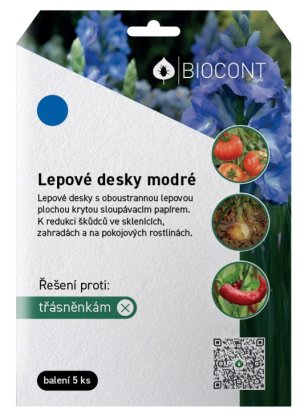 Modré lepové desky k odchytu škodlivého hmyzu na bramboříku, begoniích, gerberách, fikusech, rajčatech, okurkách, paprikách a zelí.