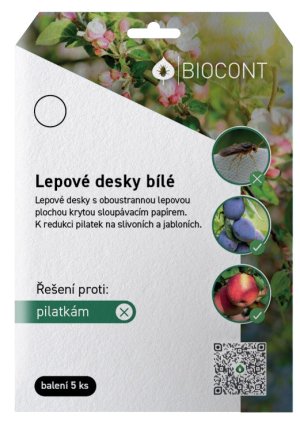 Bílé lepové desky k ochraně slivoní proti pilatce švestkové a pilatce žluté a jabloní proti pilatce jablečné.