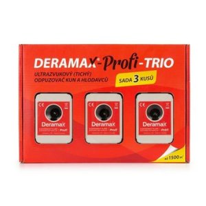Sada Deramax-Profi-Trio obsahuje 3ks špičkových ultrazvukových plašičů (odpuzovačů) kun a hlodavců Deramax-Profi + příslušenství.