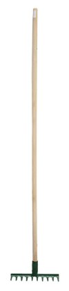 Kovové hrábě s 18 hroty a dřevěnou násadou délky 160 cm.