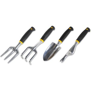 Sada zahradního nářadí Sada 4 ks ručního nářadí Lopatka,hrabičky, kultivátor, vypichovák plevele Vysoká odolnost Materiál: hliník Změkčená rukojeť