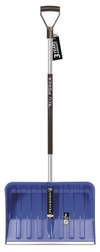 Plastové hrablo na sníh s hliníkovou lištou a hliníkovou násadou.