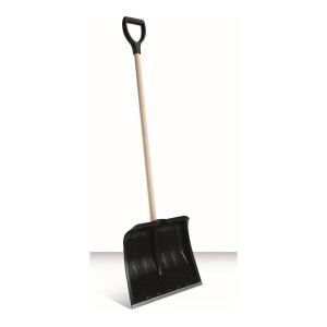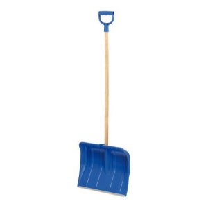 Hrablo na sníh s dřevěnou násadou a plastovou rukojetí.