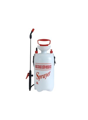Mechanický tlakový postřikovač pro aplikaci postřiků a čistících a desinfekčních prostředků, pomocník pro ochranu rostlin, objem 5 l, nádržka odolná proti různým chemikáliím.