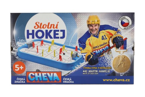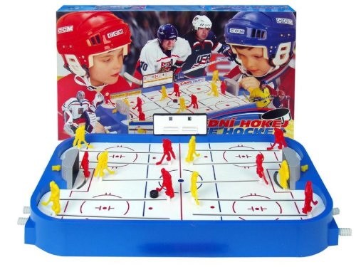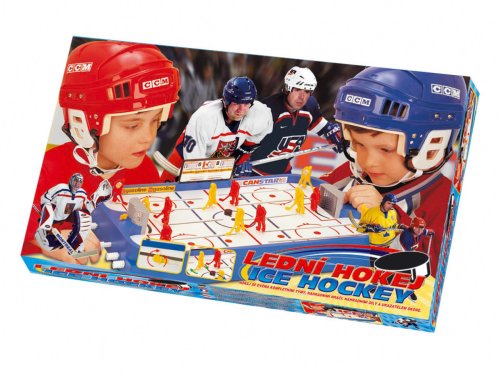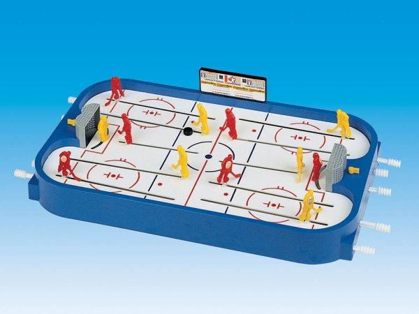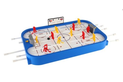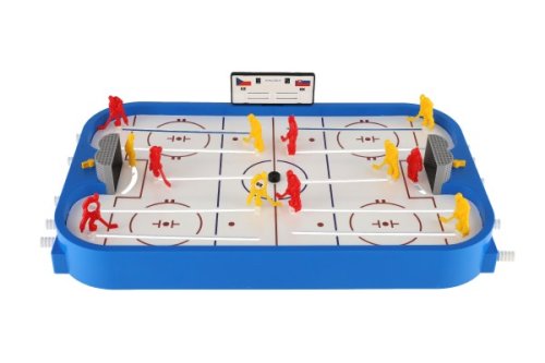 Stolní lední hokej. Obsahuje dva kompletní týmy, náhradní hráče, náhradní díly a ukazatel skóre. Rozměry hrací plochy jsou 50x30cm. Hra určená pro dva hráče. Vhodné pro děti od 3 let.