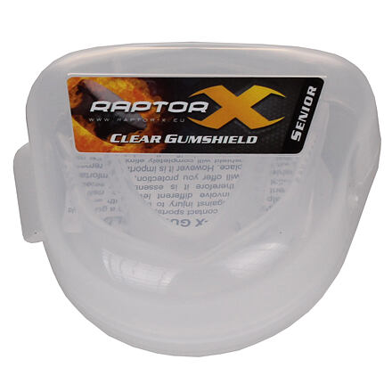 Kvalitní chránič zubů Raptor-X je bez příchutě, v čiré barvě a je vhodný na lední hokej a další kontaktní sporty. Je vyráběný ve velikosti Junior či Senior. Tento chránič splňuje bezpečnostní a hygienické normy a je certifikován. Tvarování chráničů: 1. Ohřejte vodu v konvici a nalejte ji do nádoby. 2. Ponořte chránič do vody na cca 10 vteřin. 4. Chránič opláchněte pod tekoucí vodou pokojové teploty po dobu cca 1-2 vteřin. 5. Po olíznutí svých rtů chránič umístěte do pusy a za použití zrcadla dbejte na správné umístění uprostřed Vašich úst. 6. Zkousněte a vysajte přebytečnou vodu a vzduch z chrániče. Nechte zkousnuto cca 40 vteřin. 7. Vyjměte chránič a ponořte je na 5 minut do studené vody. 8. Vyzkoušejte, zda-li zuby sedí správně.