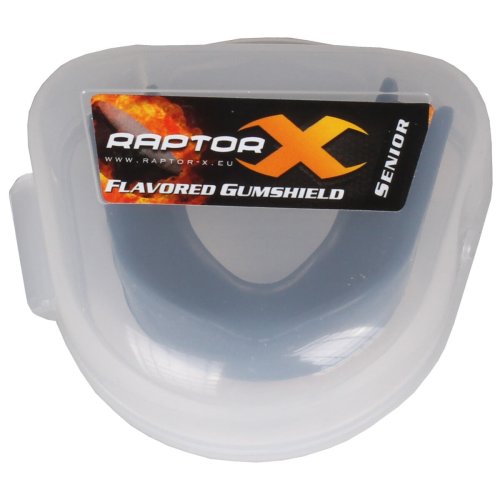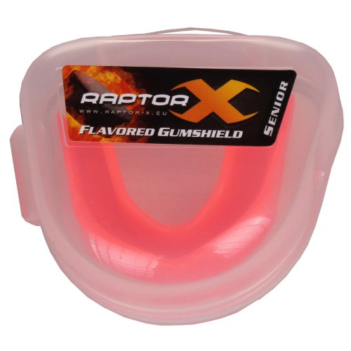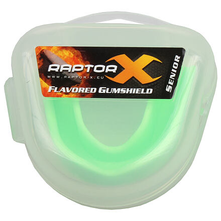 Kvalitní chránič zubů Raptor-X s příchutí je vhodný na lední hokej a další kontaktní sporty, je vyráběný ve velikostech Junior a Senior. Tento chránič splňuje bezpečnostní a hygienické normy. Příchutě: červená=jahoda, zelená=pepermint, fialová=černý rybíz. Tvarování chráničů: 1. Ohřejte vodu v konvici a nalejte ji do nádoby. 2. Ponořte chránič do vody na cca 10 vteřin. 4. Chránič opláchněte pod tekoucí vodou pokojové teploty po dobu cca 1-2 vteřin. 5. Po olíznutí svých rtů chránič umístěte do pusy a za použití zrcadla dbejte na správné umístění uprostřed Vašich úst. 6. Zkousněte a vysajte přebytečnou vodu a vzduch z chrániče. Nechte zkousnuto cca 40 vteřin. 7. Vyjměte chránič a ponořte je na 5 minut do studené vody. 8. Vyzkoušejte, zda-li zuby sedí správně.