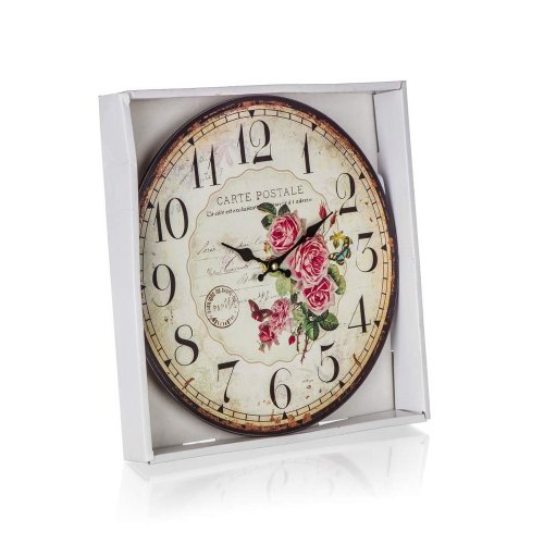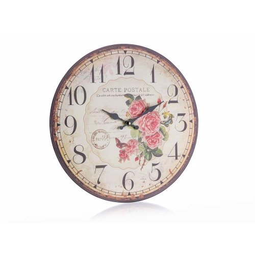 Nástěnné kulaté hodiny CARTE POSTALE s celoplošným dekorem o průměru 34 cm. Hodinový strojek je napájen jedním kusem baterie AA (není součastí balení). Produkt je ideální dekorací do vašeho bytu nebo stylové kuchyně.