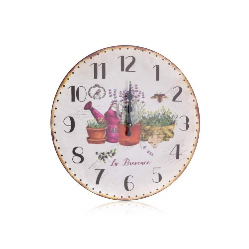 Nástěnné kulaté hodiny LAVENDER s celoplošným dekorem o průměru 34 cm. Hodinový strojek je napájen jedním kusem baterie AA (není součastí balení). Produkt je ideální dekorací do vašeho bytu nebo stylové kuchyně.