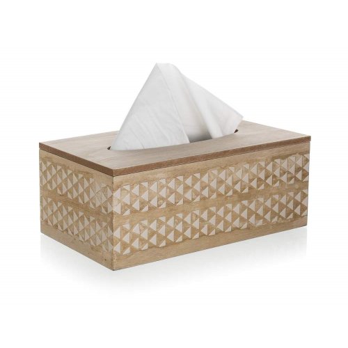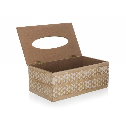 Krabička na papírové kapesníčky 24 x 13 x 9,5 cm je vybavena otvíracím víkem s panty na doplnění. Krabička je v barvě přírodního dřeva ze 3 stran zdobena bílým ornamentem.