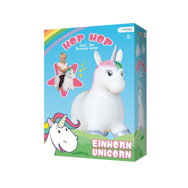 Hopsadlo HOPHOP jednorožec v bílé barvě s barevnou hřívou a barevným ocáskem. Nosnost do 50kg. Baleno v krabici. Doporučený věk 2+. Rozměr nafouknutého hopsadla je 52x25x48 cm.
