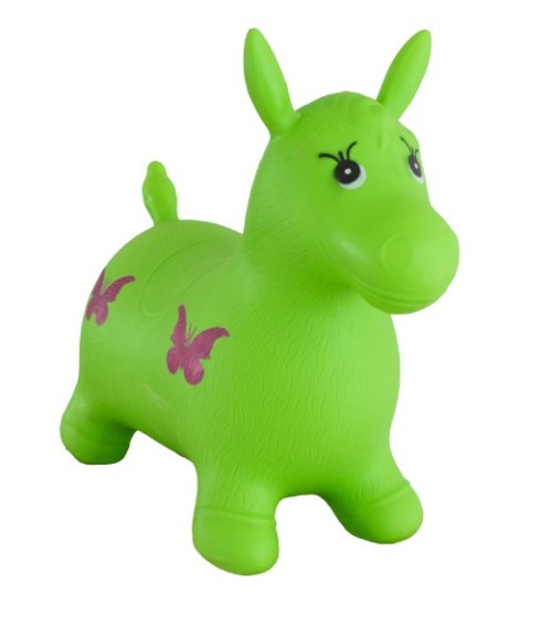 Gumové zelené nafukovací skákadlo pro děti, ve tvaru poníka z gumy, s motýlky, baleno ve vyfouknutém stavu v sáčku. Vhodné od 3 let.