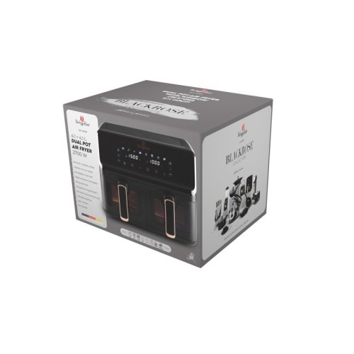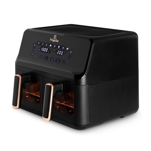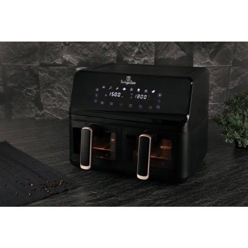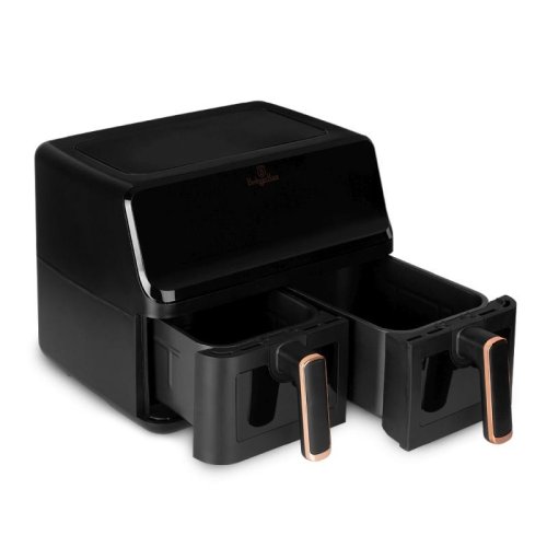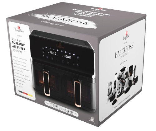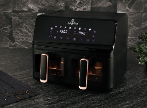 Napájení: 220-240V ~ 50Hz 2700W - Regulace teploty: 80-200° C - XXXL VELIKOST: Kapacita: 8,2L=4,1L+4,1L - Nepřilnavý zásobník na olej a koš na potraviny - lze mýt v myčce nádobí - DIGITÁLNÍ ovládání - Barva: černo růžovo-zlatá black rose - ochrana proti přehřátí - LED displej s dotykovou obrazovkou - Průzorová okénka - Protiskluzové nožičky - Časovač až na 60 min. - Zdravý způsob vaření bez oleje a tuku - Až o 80 % méně tuku