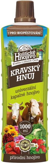 Hoštické tekuté kravský hnůj je čistě přírodní přípravek, vyrobený z extraktu kravského hnoje, vinázy (vedlejší produkt při zpracování melasy) a přírodního fosfátu. Obsahuje organické látky, základní živiny i stopové prvky v podobě přírodní složky surovin, čímž nabízí komplexní výživu a podporu růstu rostlin. Zároveň aktivuje půdní mikroflóru a zvyšuje biologickou aktivitu půdy.