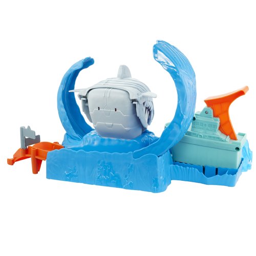 Hot Wheels™ City musí čelit útoku obrovského žraloka! Jsou tvá auta dostatečně rychlá, aby proskočila vlnobitím a neskončila ve spárech tohoto obávaného predátora? Pojď to zjistit! Ponoř své auto do nádržky se studenou vodou. Poté zvedni páčku, vlož své auto do startovacího zařízení a připrav se na závod ve vlnách. Žralok je neustále ve střehu a pokud tvůj kaskadérský kousek selže, tvůj auťák skončí jako jeho svačinka. Jakmile tvé auto uvízne v břiše mohutného robo žraloka, magicky změní svou barvu! Zavři žralokovi obří tlamu, vrať jej tak do původního stavu a zkus to znovu! Užij si spoustu zábavy s touto vychytanou závodní dráhou nebo ji připoj ke svým dalším setům Hot Wheels® a užij si ještě více strhující akce!