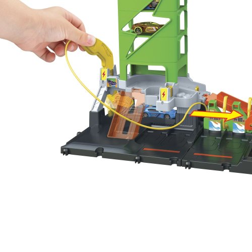 Připravte se na hru na nabité dráze se Super nabíjecí stanicí Hot Wheels City! Tento interaktivní herní set obsahuje polohovatelnou rukojeť pro nabíjení připomínající elektromobil, kterou děti zasunou na určená místa a aktivují tak skvělé detaily, například výměnu značek, výtahy pro auta a odpalovací zařízení. Zaparkujte na stanici 10 angličáků v měřítku 1:64 pro další hru i uskladnění. Jedno autíčko Hot Wheels je součástí balení, další vozidla se prodávají samostatně. Super nabíjecí stanice se připojuje k dalším setům a drahám Hot Wheels, takže si děti mohou sestavit vlastní jedinečnou městskou scenérii pro dobrodružství s volným koncem. Barvy a provedení dekorací se mohou lišit.