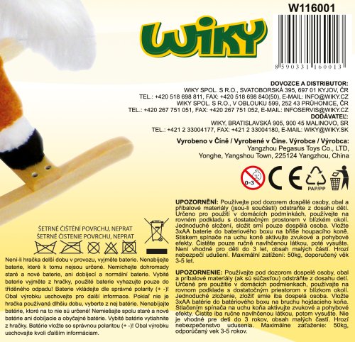 Houpací koník menší velikosti s efekty. Rozměry 74x28x58cm. Koník se třmeny a dřevěnými držadly vydává zvuky řehtání, cválání a hýbe ocasem. Při houpání dítě trénuje hrubou motoriku, učí se držet rovnováhu. 3xAA baterie nejsou součástí.