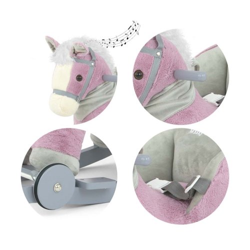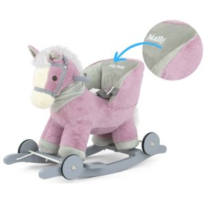 Měkoučký houpací koník Polly byl navržen pro nejmladší děti, pro které jsou tradiční houpací koně příliš velké. Pohodlné a tvarované sedadlo ve tvaru křesla a nastavitelné popruhy poskytují pohodlí a bezpečnost během bezstarostného houpání vašeho dítěte. Opěrky pro nohy na lištách a rukojeti ještě více pomáhají udržet rovnováhu. Překlopením jednoduchého mechanismu na lištách vysunete kolečka, čímž ve vteřině změníte houpací hračku v jezdícího koníka. Houpací lišty lze jednoduše odšroubovat. Po stisknutí ouška koník vesele zařechtá, po stisknutí druhého vydá zvuk klusajícího koně. Baterie se vkládají do poudra umístěného na bříšku.<BR>Charakteristika:<BR>- dřevěné houpací lišty s opěrkami pro nohy<BR>- hebký a příjemný materiál<BR>- pohodlné sedlo ve tvaru křesla<BR>- možnost demontáže houpacích lišt<BR>- baterie (2x AA) nejsou součástí hračky<BR>- nosnost do 30 kg<BR>- od 12 do 36 měsíců<BR> Rozměry:<BR>- výška 50 cm<BR>- výška na kolečkách +3cm<BR>- délka lišt 68 cm<BR>- délka koně 51 cm<BR>- šířka 34 cm<BR>- výška sedla od země 32 cm<BR>- vzdálenost sedadla od opěrek 28 cm<BR>- šířka sedla 20 cm<BR>- výška opěradla 15 cm<BR>Rozměry balení:<BR>- 61x47x36 cm<BR>- hmotnost netto 3,7 kg<BR>- hmotnost brutto 4,7 kg