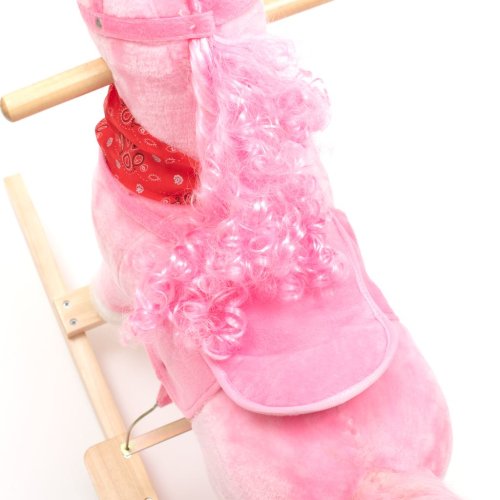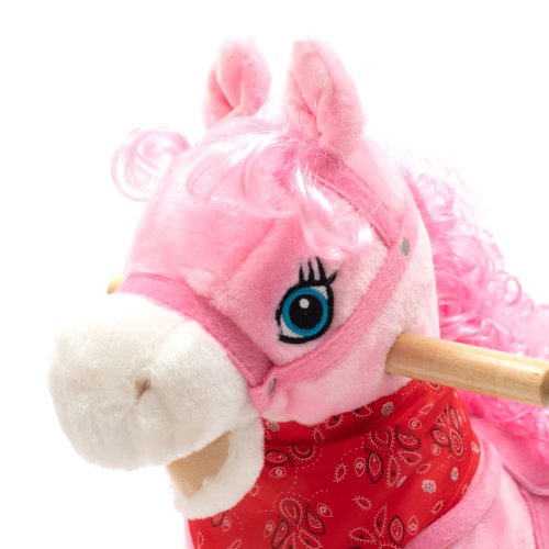 Neobyčejně krásný houpací koník s červeným šátkem na krku. Po zmáčknutí oušek koník zavrtí ocáskem, otevírá ústa, vydává zvuky klusajícího koně nebo zpívá písničku. Pohodlné sedlo, pevná uzda, dřevěné rukojeti nebo kovové třmeny zajistí vašim kovbojům ještě větší stabilitu a komfort během houpání. Je vyroben z měkkého plyšového materiálu, pevné dřevěné lišty nebo rukojeti lze snadno odšroubovat. Baterie se vkládají do pouzdra umístěného na bříšku koníka.