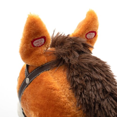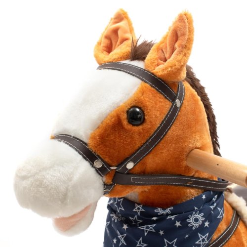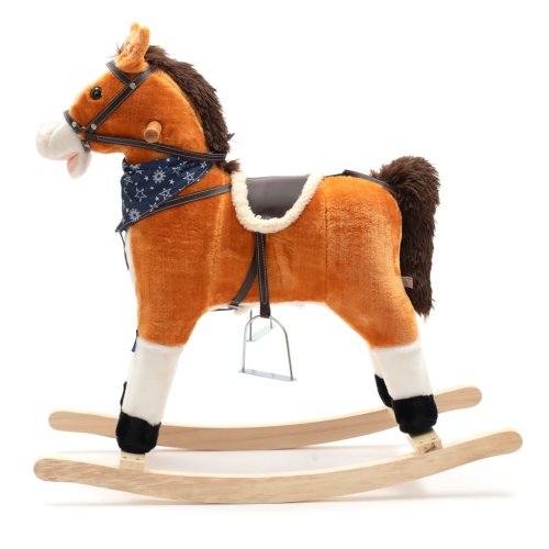 Neobyčejně krásný houpací koník s červeným šátkem na krku. Po zmáčknutí oušek koník zavrtí ocáskem, otevírá ústa, vydává zvuky klusajícího koně nebo zpívá písničku. Pohodlné sedlo, pevná uzda, dřevěné rukojeti nebo kovové třmeny zajistí vašim kovbojům ještě větší stabilitu a komfort během houpání. Je vyroben z měkkého plyšového materiálu, pevné dřevěné lišty nebo rukojeti lze snadno odšroubovat. Baterie se vkládají do pouzdra umístěného na bříšku koníka.