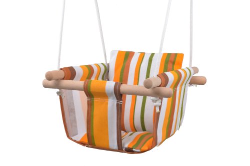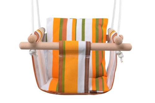 Houpačka plátěná pruhovaná. 100% bavlna. Délka závěsných lan 1,8 m. Polyesterová lana o průměru 7 mm. Délka dřevěných opěrek 40 cm. Nosnost 80 kg.