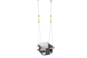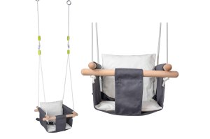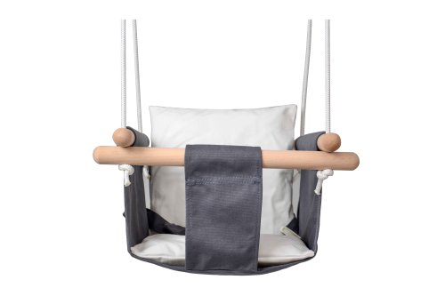 Houpačka plátěná šedá. 100% bavlna. Délka závěsných lan 1,8 m. Polyesterová lana o průměru 7 mm. Délka dřevěných opěrek 40 cm. Nosnost 80 kg.