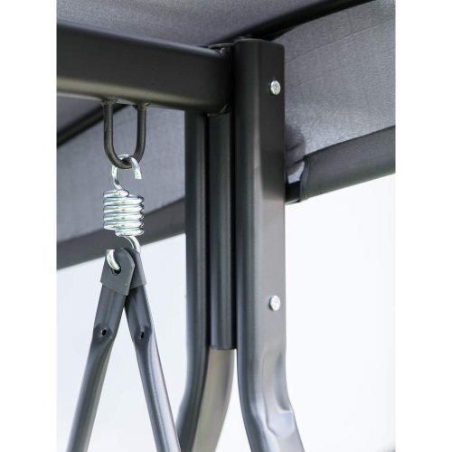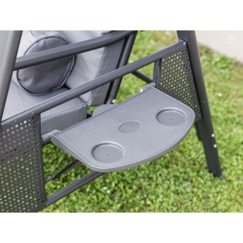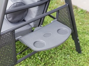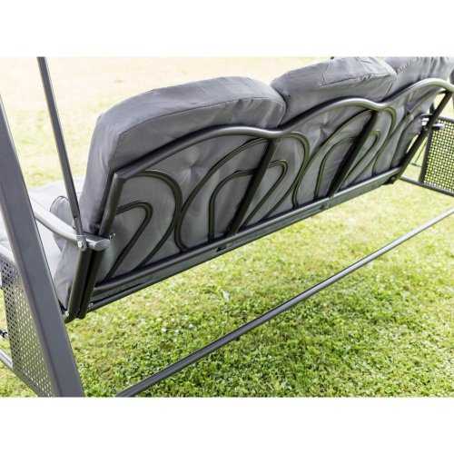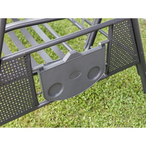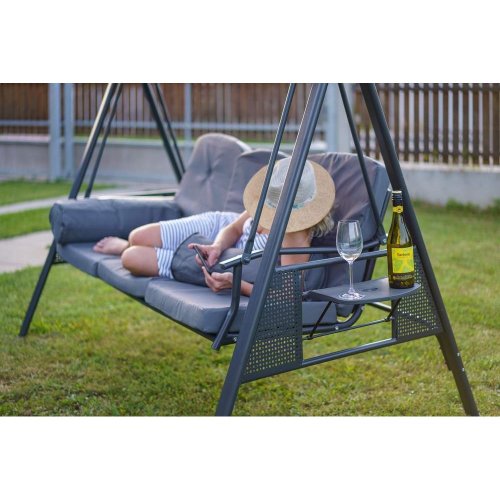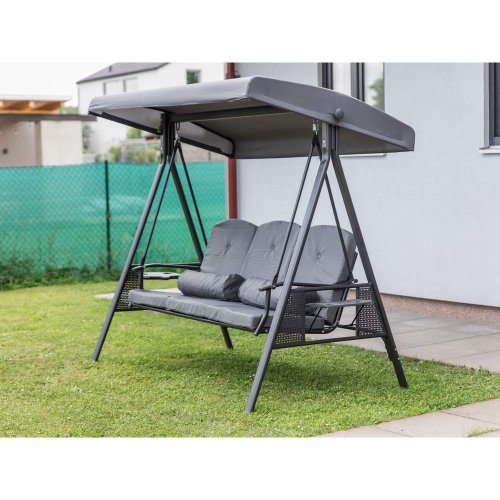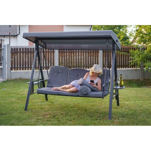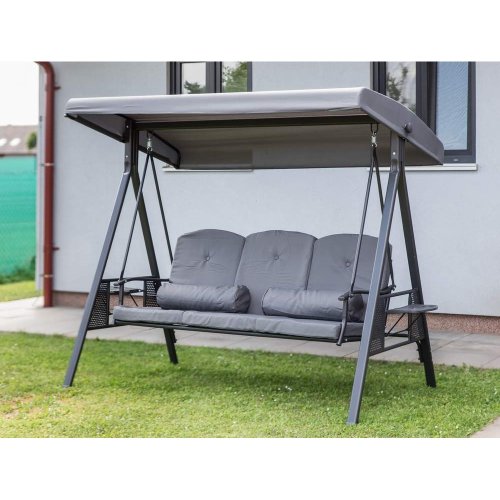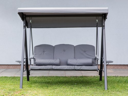 Zahradní houpačka RUJANA má vysoce stabilní masivní kovovou konstrukci, ošetřenou práškovým lakováním a 3 samostatné sedáky z polyesteru o síle cca 8 cm, které zajišťují komfortní posezení. Rozměry houpačky: 200 x 116 x 173 cm, nosnost 300 kg. Dalšími výhodami této houpačky je nastavitelná stříška proti slunci, doplňkový kulatý polštářek pro dokonalý relax a také dva výklopné stolky po stranách houpačky pro odložení oblíbeného občerstvení či knihy.