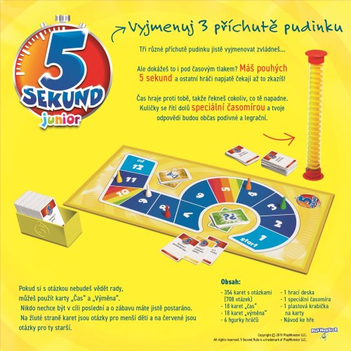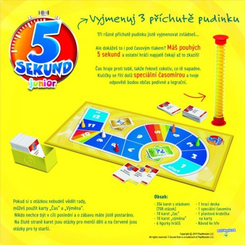 Tři různé příchutě pudinku jistě vyjmenovat zvládneš... Ale dokážeš to i pod časovým tlakem? Máš pouhých 5 sekund a ostatní hráči napjatě čekají až to zkazíš! Čas hraje proti tobě, takže řekneš cokoliv, co tě napadne. Kuličky se řítí dolů speciální časomírou a tvoje odpovědi budou občas podivné a legrační. Pokud si s otázkou nebudeš vědět rady, můžeš použít karty "Čas" a "Výměna". Nikdo nechce být v cíli poslední a o zábavu máte jistě postaráno. Na žluté straně karet jsou otázky pro menší děti a na červené jsou otázky pro ty starší. Rozměry balení 26 x 26 x 8 cm. Vhodné pro děti od 6 let.