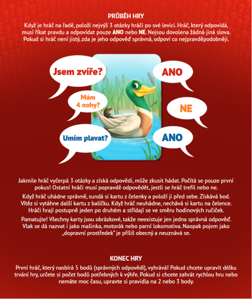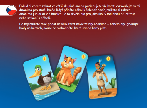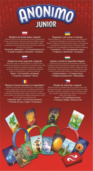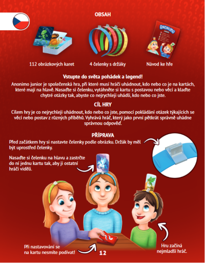 Vstupte do světa bájí a legend! Anonimo junior je společenská hra, při které musí hráči uhádnout, kdo nebo co je na kartách, které mají na hlavě. Nasaďte si čelenku, vytáhněte si kartu s postavou nebo věcí a klaďte chytré otázky tak, abyste co nejrychleji uhádli, kdo nebo co jste. Hra obsahuje: 112 obrázkových karet, 4 čelenky s držáky, návod. Rozměr krabice: 14,5 x 26 x 10 cm Vhodné pro děti od 4 let