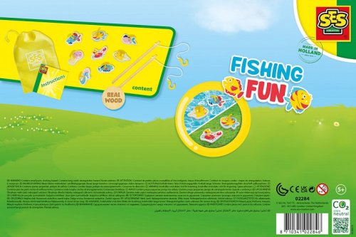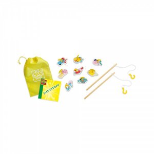 Tato zábavná sada na chytání ryb je ideální pro hraní uvnitř i venku a může se používat na suchu, na trávě, nebo přímo ve vodě (ryby plavou). Sada je určena pro dva hráče, kteří si mohou zasoutěžit, kdo chytí více pestrobarevných rybiček.Sada obsahuje:Dřevěné pruty: 2 robustní dřevěné rybářské pruty.Pěnové ryby: 8 veselých, ilustrovaných ryb a mořských živočichů vyrobených z pěny (s plastovými háčky/očky).Rybářské háčky: Plastové háčky, které se nasazují na pruty.Textilní taška: Praktická textilní taška na uložení a přenášení sady.