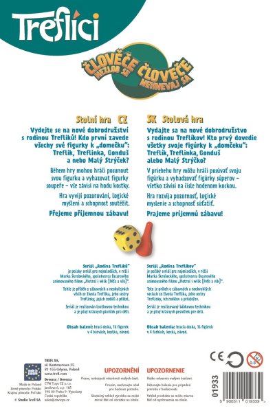 hrací plán s motivem rodiny Treflíků hrací kostku 16 figurek ve 4 různých barvách návod ke hře