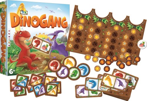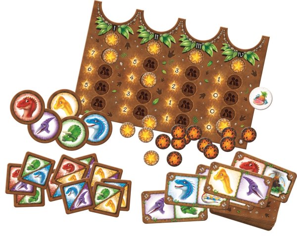 oboustranná hrací deska 60 karet s dinosaury 3 základní karty 5 základních žetonů s dinosaury 10 žetonů s dinosaury pro složitější variantu 18 žetonů s lávou 1 žeton s pamlskem návod ke hře