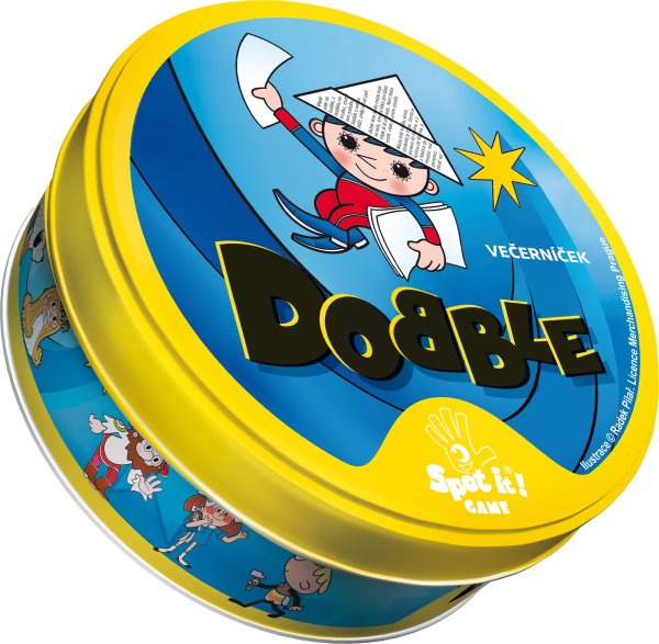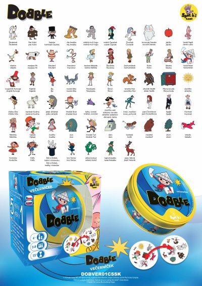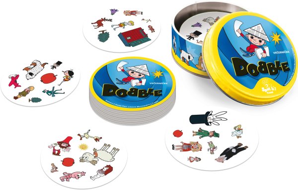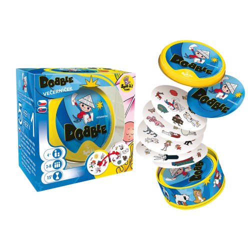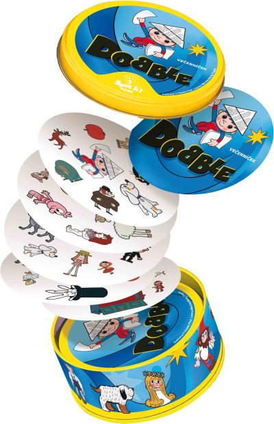 Neexistuje snad nikdo, kdo by neměl rád oblíbený dětský pořad Večerníček. Již přes půl století baví malé i velké diváky u nás i na Slovensku. Připomeňte si společně s celou vaší rodinou oblíbené postavičky z pohádek a užijte si tu nejlepší postřehovou zábavu. Bob a Bobek, loupežník Rumcajs, Ája a maxipes Fík, Edudant a Francimor a mnoho dalších oblíbených postav z Večerníčků, jak je znáte. Rychlost, postřeh, reflexy! Buďte první, kdo najde shodný symbol na dvou kartách! Dobble, to je 57 různých symbolů, 55 karet, 8 symbolů na kartě a každé dvě karty spolu mají společný pouze jeden! Hra nabízí zcela unikátní zábavu. Hráči zde hledají dva stejné symboly na kartách při různých verzích hry v pravidlech je popsáno celkem 5 her. Super jsou kulaté karty i jednoduchá pravidla, vysvětlená doslova za pár sekund. Obsah balení je 55 karet v plechové krabičce a 1 česká a slovenská pravidla.