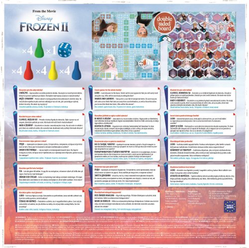 Klasická stolní hra pro celou rodinu s motivem animovaného filmu Ledové království 2. Postav figurky do startovacího domečku. Počkej až hodíš na kostce šestku a můžeš vyrazit. Tvým úkolem je dostat všechny tvé figurky až do cílového domečku. Dej pozor, aby tě cestou soupeři nevyhodili zpátky na start! Balení obsahuje: