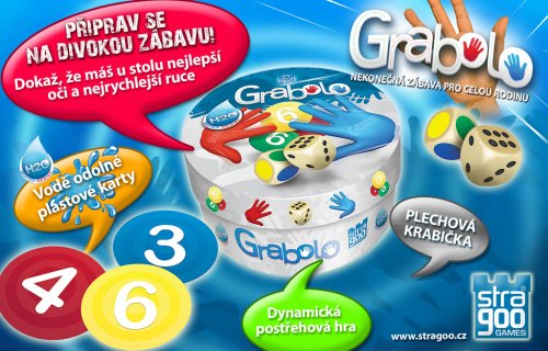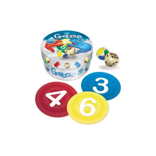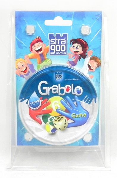 GRABOLO je rychlá kontaktní postřehová hra. Dokaž, že máš u stolu nejlepší oči a nejrychlejší ruce. Kostky určí kombinaci barvy a čísla a ty musíš rychle reagovat. Cílem hry je získat předepsaný počet karet. Plechová krabička obsahuje 36 plastových voděodolných karet, 1 barevnou kostku a 1 kostku s čísly Hra je určena pro 3 - 5 hráčů, trvá 8 - 10 minut, doporučený věk 6 - 99 let.
