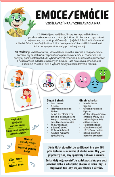 Malý objevitel – Emoce je vzdělávací hrou, při které se děti učí emoce rozpoznávat a pojmenovat, rozumět pocitům svým i jiných lidí, hodnotit sílu emocí a hledat řešení náročných situací. Hra posiluje emoční a sociální dovednosti dětí a buduje pevné základy pro zdravý rozvoj.