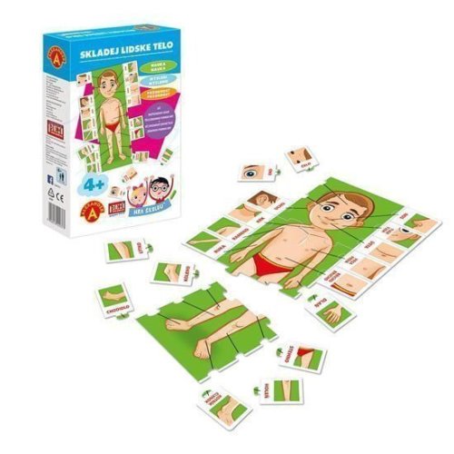 HRA ŠKOLOU® - SKLÁDEJ LIDSKÉ TĚLO, ocenění Hračka roku 2018 - 3.místo, je naučná hra pro děti od 4 let, pomocí níž se děti učí zábavnou formou rozvíjet slovní zásobu a paměť. Pomocí puzzle kartiček se učí rozpoznávat, kde je na těle ruka, oko, prsty, nos a správně je pojmenovat. Každá kartička má jiný tvar, je jiná a tak zapadne pouze tam, kam patří. Naučná HRA ŠKOLOU® - SKLÁDEJ LIDSKÉ TĚLO je krabička, se kterou holčičky a kluci objevují lidské tělo. Víte kolik prstíků je na ruce, kolik máme nohou? Nebo kde je nos, pusinka, či ouško? To vše se děti teď hravě naučí. Celá postava člověka a její části je rozdělena na 3 větší destičky a 18 menších. Pevné destičky do sebe perfektně zapadnou a drží pohromadě jako dílky puzzle. Manipulace s kartičkami je velice snadná. Zapojit do hry se může i více dětských hráčů, kteří mohou napovídat a pomáhat si a tak zjistit, jak může být lidské tělíčko zábavné. Hra obsahuje 3 velké destičky pomocí níž si složíte postavičku chlapečka. Váš nový "kamarád" má na sobě označené tenké linky, které pomáhají správně najít, kde má hlavičku, nohu, ruku, zápěstí, oko, nos či pusinku. Menší kartičky se přikládají podél tělíčka a vždy správně zapadnou do výřezu, pokud děti zvolí správné místo. Děti hra nejen zabaví, ale také přirozeně rozvíjí své logické uvažování, pozorovací a kombinační schopnosti. Tato hra je také vhodná i do školek a kolektivů, kde se děti mohou střídat v pokládání jednotlivých dílků a navzájem se povzbuzovat a opravovat. Balení obsahuje: 3 ks velkých destiček z pevného kartonu18 ks malých destiček s částmi těla český a slovenský návod Hlavní vlastnosti: vhodná od 4 letpomáhá dětem, ve spolupráci s dopělým, poznávat a pojmenovat části svého těladěti poznají tělo od hlavy až k patěpodporuje logické myšlení, koncentraci a soustředěnírozvíjí slovní zásobu