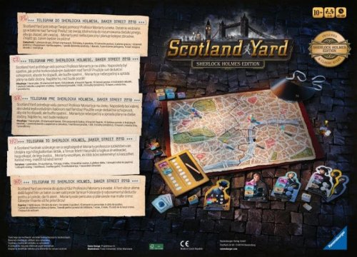 Scotland Yard potřebuje vaši pomoc! Profesor Moriarty je na útěku. Naposledy byl spatřen, jak prchá horkovzdušným balonem nad Temží! Použijte své dedukční schopnosti, abyste ho dopadli, ale buďte opatrní... Moriarty je nebezpečný a spřádá plány na další zločiny. Najděte ho, než bude pozdě! V této verzi hry Scotland Yard pátrá Sherlock Holmes a jeho společníci po zločineckém géniovi, profesoru Moriartym. Můžete si vybrat, jestli budete hrát detektivy, nebo Moriartyho. Hru můžete hrát podle původních pravidel nebo podle speciálních pravidel Sherlocka Holmese. „Ach, to jste vy... pojďte dál! Pan Holmes a ostatní vás již očekávají. Společnými silami jistě uspějete a konečně dopadnete profesora Moriartyho!“ Dveře bytu na Baker Street 221B se zavírají – hon na Moriartyho začíná! Obsahuje: 1 herní plán, 29 startovních karet, 134 jízdenek, 6 hracích figurek, 10 žetonů postav, 6 hráčských tabulek, 1 cestovní tabulku s papírem a tužkou, 1 kartonový proužek, 1 kšilt, 3 kroužky (strážníci), 15 karet z místa činu, 1 pravidla hry