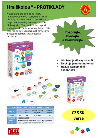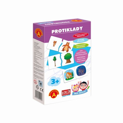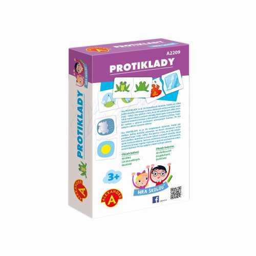 Děti se učí protiklady, tvar spojení jim napoví, jestli opravdu našli správnou dvojici. Naučné hraní pro malé objevitele pro objevování protikladů - od 3 let do 6 let. Tvar spojení dílků dětem napoví, jestli opravdu našli správnou dvojici. Pomocí dvoudílných velkých kartiček s obrázky se děti učí chápat protiklady (např. malý – velký, den – noc, vysoký - hluboký atd). Skvělá mnemotechnická pomůcka. Rozměry balení 16 x 25 x 5 cm. Vhodné pro děti od 3 let.