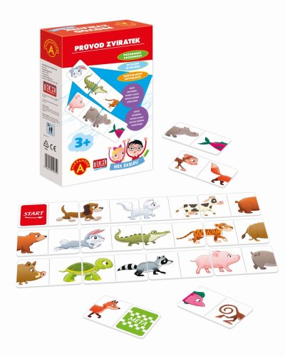 Ocenění Hračka roku 2018 (3.místo). Naučná hra od 3 let, pomocí níž se děti učí chápat dělení a názvy zvířátek, zlepšují si postřeh a logické uvažovaní. Navíc si rozšiřují svou slovní zásobu. Rozvíjí pozorovací, kombinační schopnosti a trénují postřeh. Úkolem je složit zířátka ze dvou polovin, tak aby na sebe postupně navazovaly a vznikl průvod, kde "pochodují" zvířátka jedno za druhým. Skládání začne u dílku s nápisem ,,START", přidávané dílky by měly tvořit celý obrázek dalších zvířátek. Při skládání si děti povídají s rodiči a popisují to, co vidí na obrázku. Učí se při tom rozeznávat nejznámější zvířátka a také si rozšiřují svou zásobu slov a zlepšují si výslovnost. Hra je skvělou příležitostí pro rodiče, jak trávit čas se svými dětmi. - Rozvíjí obrazotvornost a paměť - Pomáhá zlepšovat motoriku a soustředění - Pomáhá s rozvojem vyjadřování - Rozvíjí pozorovací a kombinační schopnosti Box obsahuje: 16 kusů velkých, pevných destiček a návod.