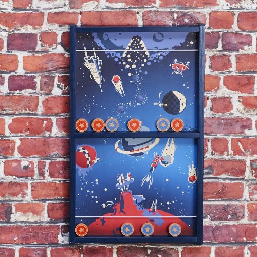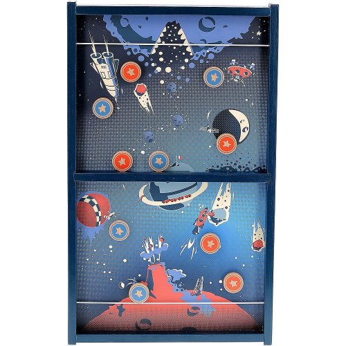 3, 2, 1… a letíme vzhůru! Cestujte vesmírem v této velkolepé shuffleboardové hře s retro vzhledem. Cílem je zbavit se všech svých puků dříve než soupeř na své straně herní plochy nebo uklidit všechny puky ze své hrací plochy k soupeři. Musíte použít gumičku upevněnou na bocích jako vystřelovač a být nejšikovnější, abyste zamířili na jedinou díru ve středu hry a puk zde prolétl. Pro nejlepší střelce může střed nahradit jiná překážka se 2 mimostředovými otvory! Hlavní vlastnosti: zábavná postřehová hra rozvíjí motoriku dětístředové otvory jsou vyměnitelné pro jednodušší a složitější hruoriginální retro vzhled
