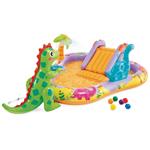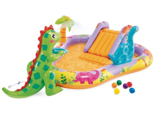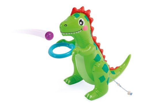 Skvělé hrací centrum v designu dinosaurů, se kterým si v horkých letních dnech užiješ spoustu zábavy a osvěžení. Možnost připojení zahradní hadice pro parádní vodotrysk. Součástí centra je vodní skluzavka a 6 míčků.