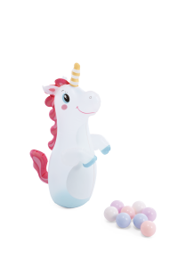 K hracím prvkům patří také nafukovací boxovací panák ve tvaru jednorožce s růžovou hřívou a žlutým rohem, který děti může pobavit aktivní hrou. K dispozici je osm barevných míčků, které lze použít k prohazování přes obruč umístěnou na oblouku hradu, čímž se rozvíjí motorické schopnosti a koordinace. Celkové provedení je z kvalitního PVC materiálu s hladkým povrchem, který je snadno omyvatelný.
