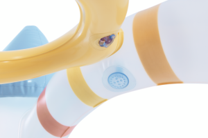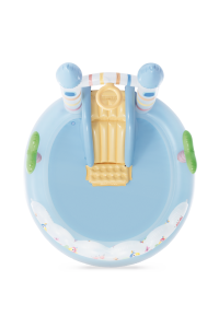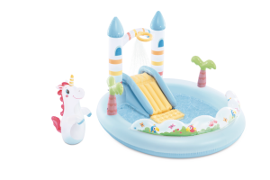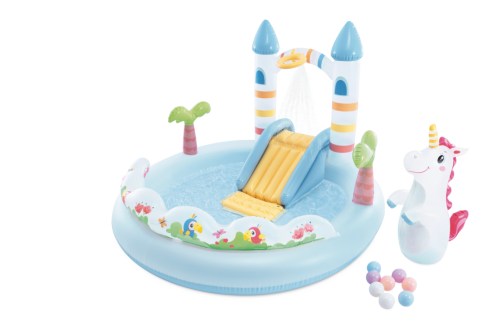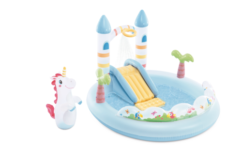 Hrací centrum Jednorožčí hrad je nafukovací herní set určený pro děti od dvou let, který kombinuje zábavu s možností osvěžení v horkých letních dnech. Je navržen v jemných pastelových barvách s motivem kouzelného hradu a doplněn veselými ilustracemi ptáčků, motýlů a obláčků, které přispívají k pohádkové atmosféře. Dominantou hracího centra je skluzavka v žluté barvě, která je opatřena extra polstrováním na dojezdové ploše, což zajišťuje bezpečný a pohodlný skluz.