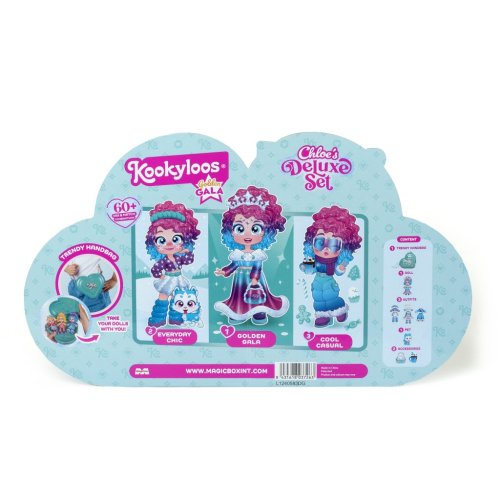 Chloe miluje stylové a okouzlující outfity a vždy ví, jak zazářit – ať už venčí svého pejska v parku na sluníčku, jde nakupovat s kamarádkami nebo se chystá na slavnostní Golden Gala!V setu Chloe´s Golden Gala Deluxe najdeš 3 různé outfity pro každou příležitost. Můžeš je mezi sebou libovolně kombinovat a doladit doplňky, aby vznikly jedinečné a speciální looky. Díky třem jedinečným výrazům Kookyloos, které lze změnit jediným kliknutím, můžeš navíc sladit styl i s různým make-upem.Součástí je také elegantní kabelka ve tvaru srdce, ideální na cestu na Golden Gala – a hlavně dost prostorná, aby sis v ní mohla vzít všechny panenky i doplňky!1 exkluzivní panenka,3 outfity,2 páry bot,2 tiáry,1 svačinka,1 domácí mazlíček,1 kabelka pro děti ve tvaru srdce.