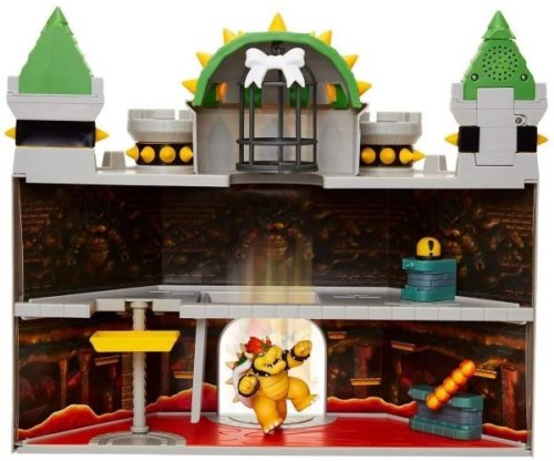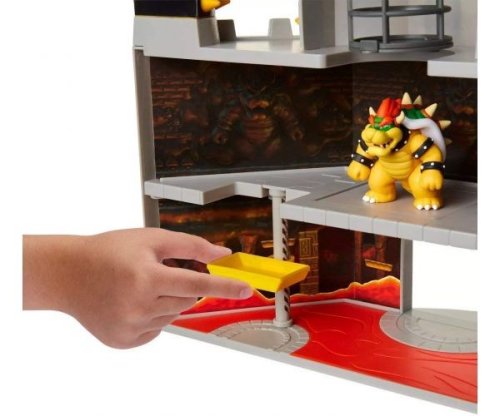 Hrací sada Deluxe Super Mario a Bowser´s hrad se zvukem vám umožní prozkoumat tuto klasickou úroveň z videoher Super Mario. Součástí této herní sady jsou exkluzivní 9 cm figurky Bowsera v interaktivním prostředí s funkčními mechanismy a autentickými zvuky ve hře Můžete posunout výtah nahoru a dolů roztočte ohnivé koule otevřete dno klece a porazte Bowsera spuštěním padacích dveří, abyste ho shodili do lávy pod nimi.