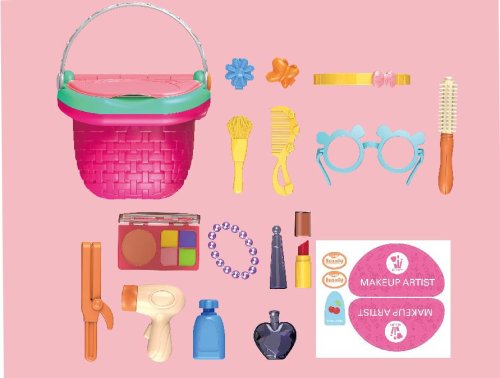 Košík plný make-up doplňků. Košík obsahuje 18 kusů doplňků jako je např. parfém, rtěnka, stíny, fén, doplňky do vlasů.