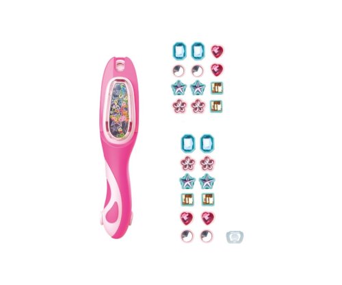 Součástí balení je také růžový aplikátor s ergonomickým tvarem, který umožňuje snadnou a bezpečnou instalaci ozdob do vlasů. Aplikátor má průhledné okénko, ve kterém jsou viditelné drobné barevné korálky, což dodává výrobku atraktivní vizuální prvek. Díky tomuto nástroji mohou děti jednoduše připevnit dekorace bez potřeby lepidel či složitých pomůcek, což zaručuje pohodlné a čisté používání.