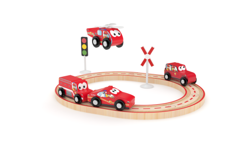 J`adore je řada vzdělávacích hraček pro nejmenší, vyrobených z ekologicky udržitelného dřeva, bez chemikálií. Produkt stimuluje dětskou fantazii. Set je vhodný pro děti od 18 měsíců. Set obsahuje koleje a vozidla v hasičském designu.